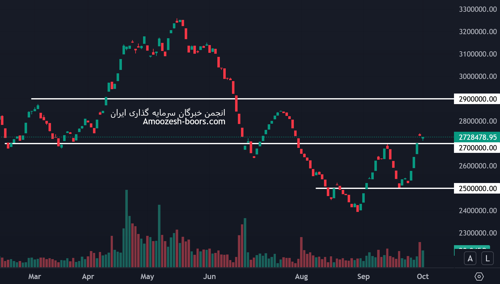 از منظر تکنیکالی شاخص کل بعد از اصلاح پر فشاری که تجربه کرده و از محدوده حمایتی 2.400.000 واحد برگشته و همونطور که هفته قبل گفته شد به مقاومت 2.700.000 واحد رسیده، در صورت عبور از این محدوده، اولین حمایت 2.500.000 واحد خواهد بود، در صورت ورود به فاز صعودی، اولین مقاومت شاخص 2.700.000 واحد در نظر گرفته خواهد شد.