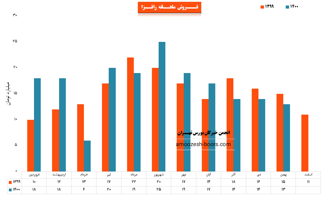 نماد رافزا (شرکت رایان هم افزا) در تیر ماه 1401 حدود مبلغ 18 میلیارد تومان درآمد داشته که این میزان در مقایسه با ماه گذشته 25% و همچنین در مقایسه با مدت مشابه سال گذشته 10% افت درآمد داشته است.