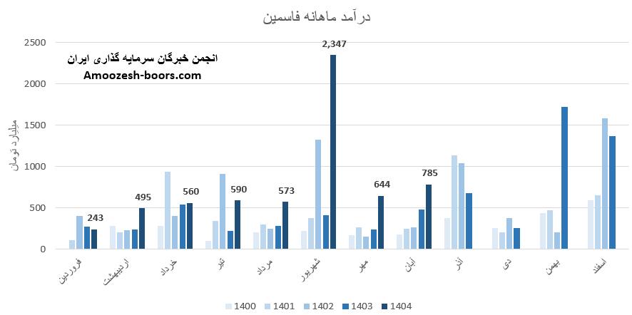 سهام فاسمین از ابتدای سال مالی تا پایان مرداد 1404، مجموع درآمد ثبت شده شرکت به 2460 میلیارد تومان رسیده که نسبت به مدت مشابه سال گذشته 58 درصد رشد داشته، و در همین حال 37 درصد از کل درآمد سال گذشته تحقق یافته است.